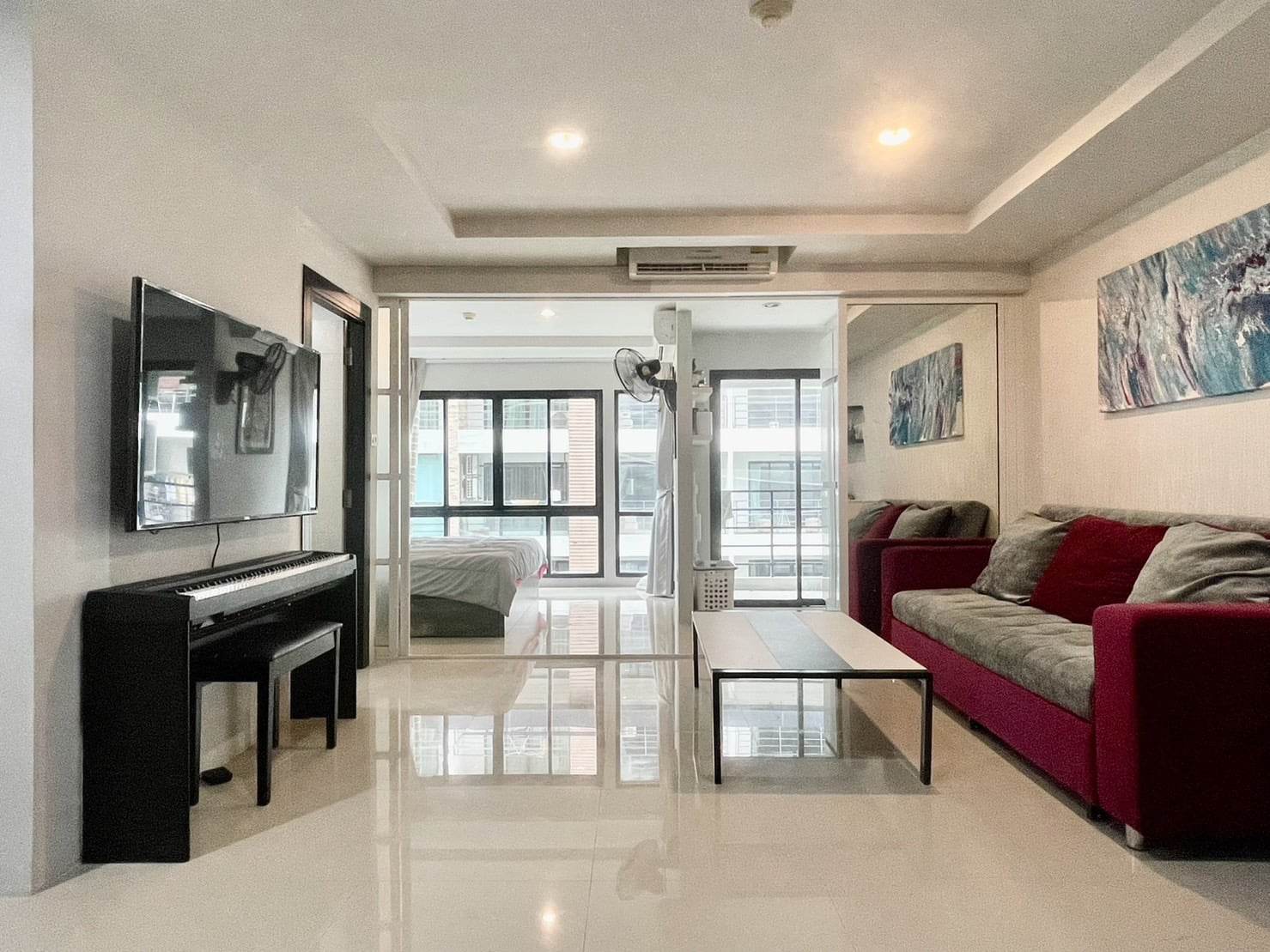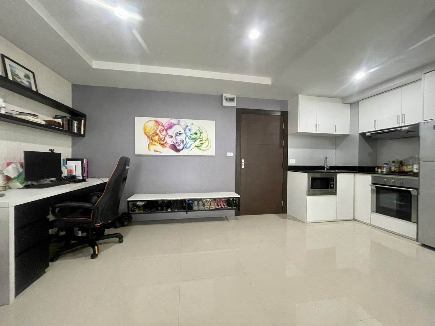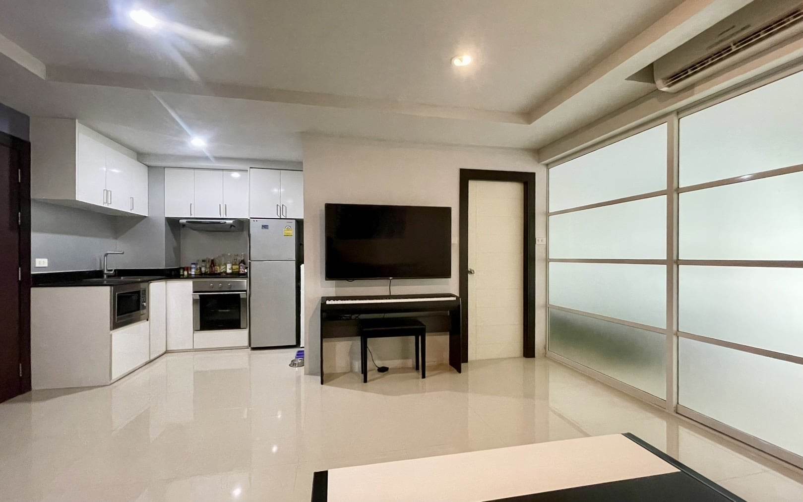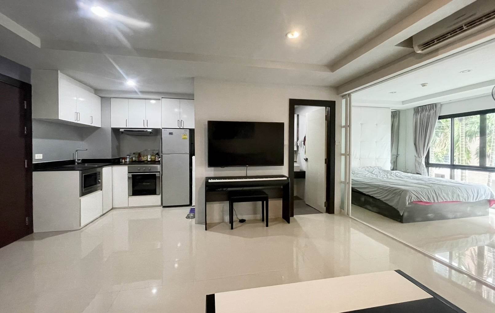 Fully  furniture and TV , Desk, drawers, shoe bench, book shelves, bathroom cabinet and bed are high quality furniture from Euro design furniture. We can as well, if you want, let the mattress, that is very clean, and expensive 100% latex mattress. Kitchen is good quality as well, with induction hub, built-in oven and microwave. TV is a smart TV 55'. The 3 panels sliding door separating the bedroom from the living room can have 2 panels completely slide inside the bedroom and make the room wide open.