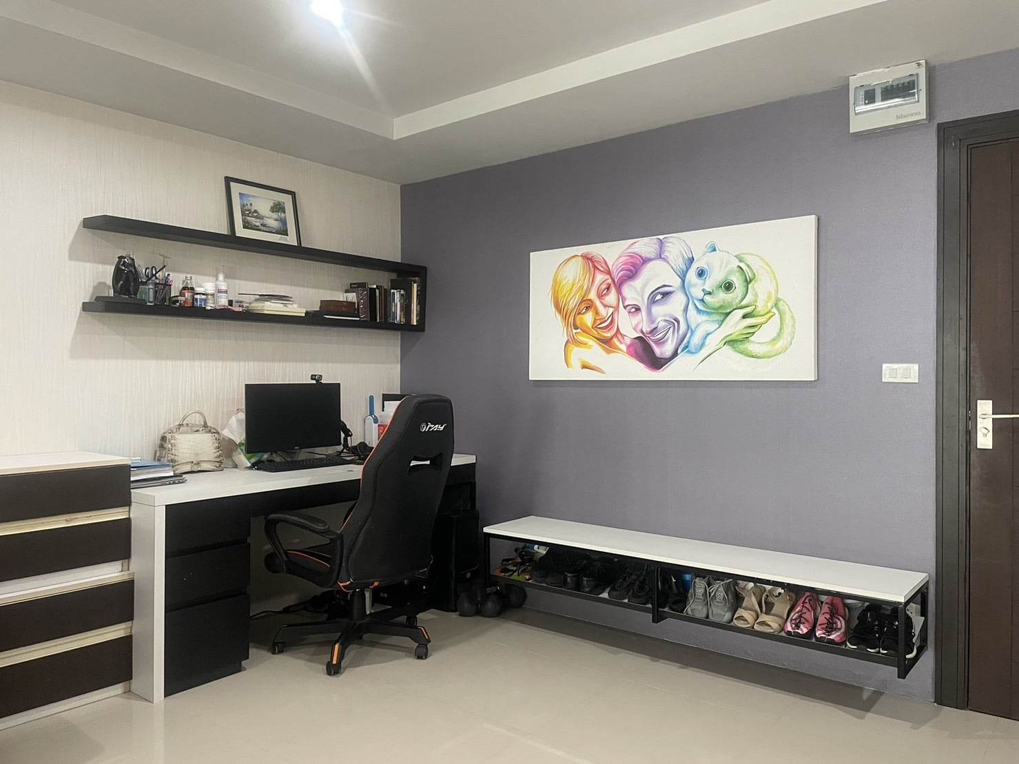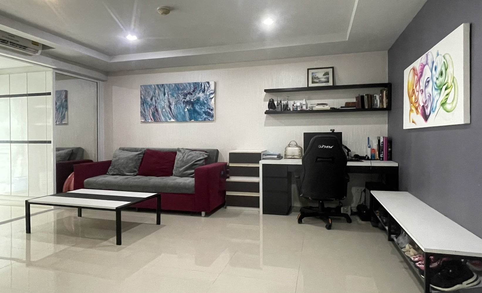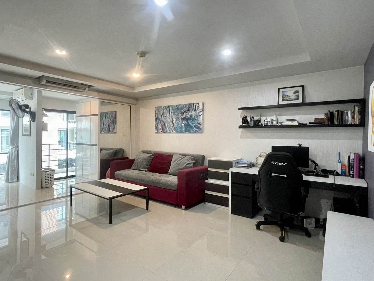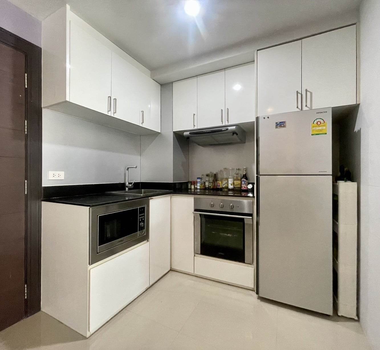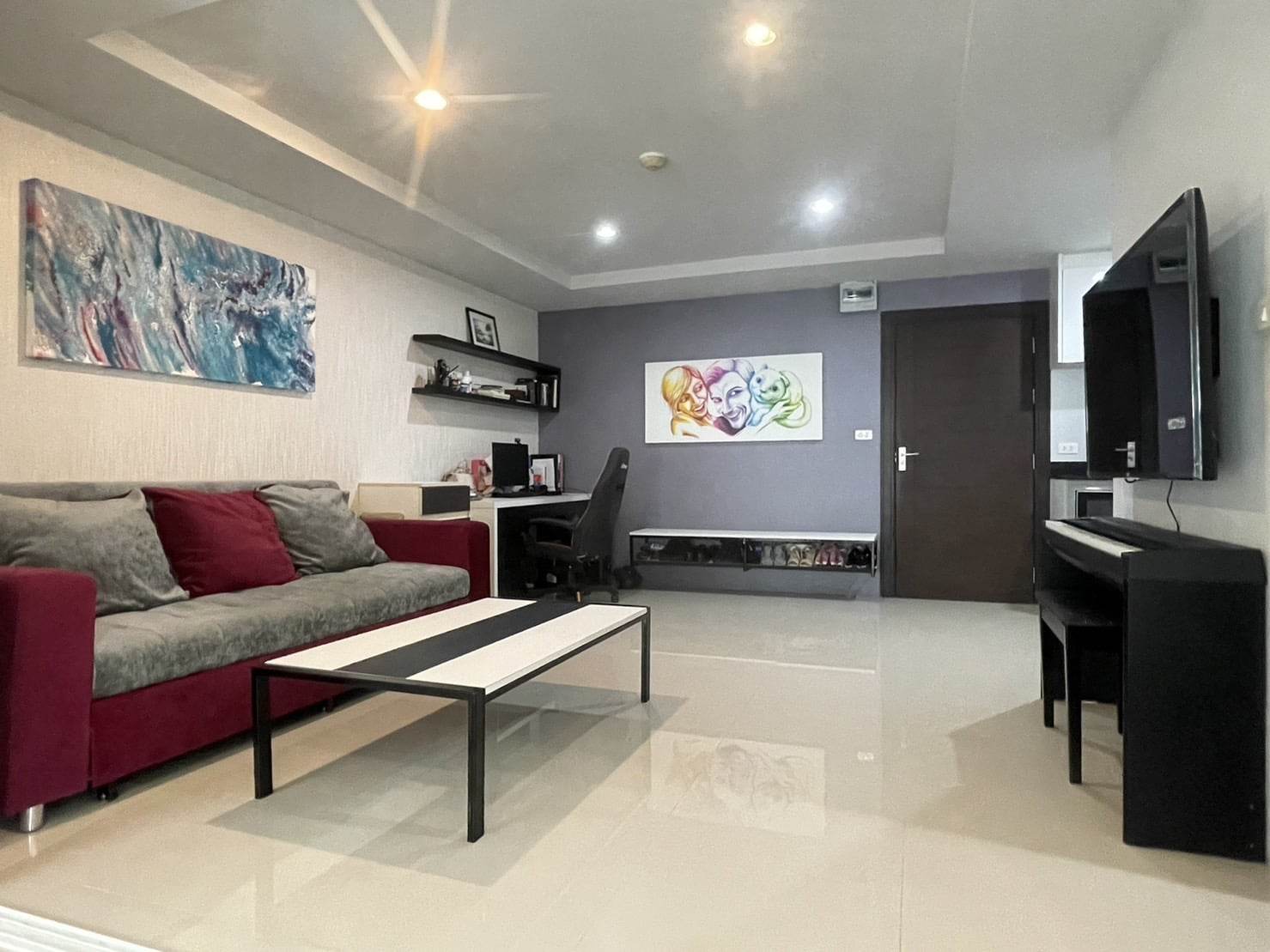 Fully  furniture and TV , Desk, drawers, shoe bench, book shelves, bathroom cabinet and bed are high quality furniture from Euro design furniture. We can as well, if you want, let the mattress, that is very clean, and expensive 100% latex mattress. Kitchen is good quality as well, with induction hub, built-in oven and microwave. TV is a smart TV 55'. The 3 panels sliding door separating the bedroom from the living room can have 2 panels completely slide inside the bedroom and make the room wide open.
