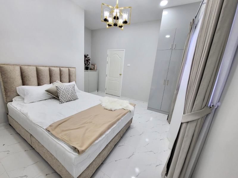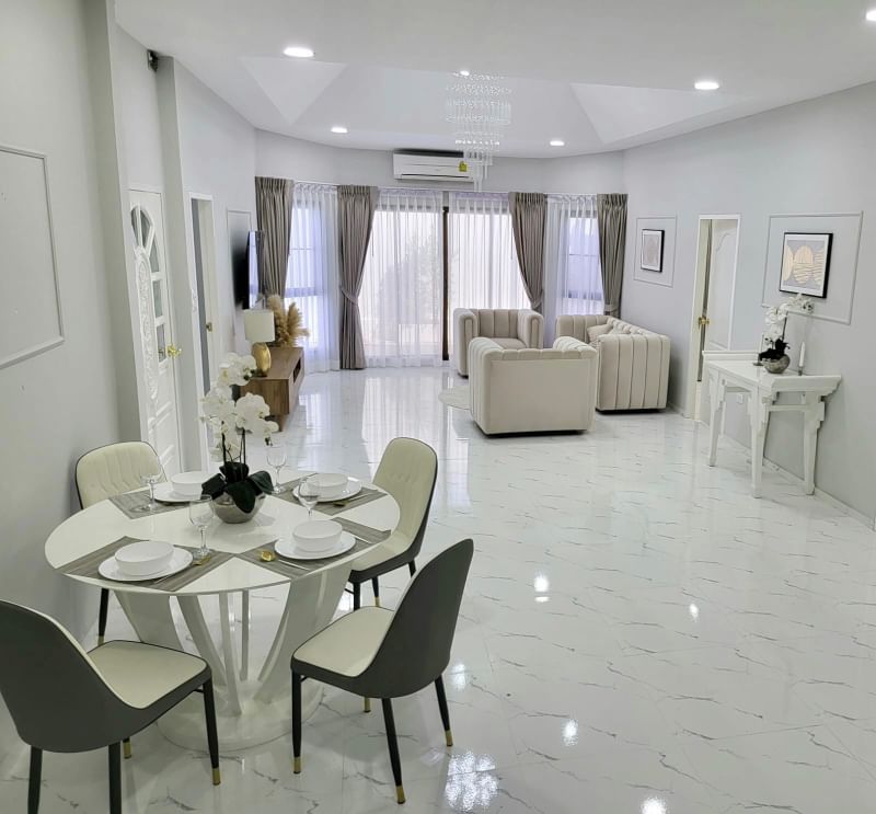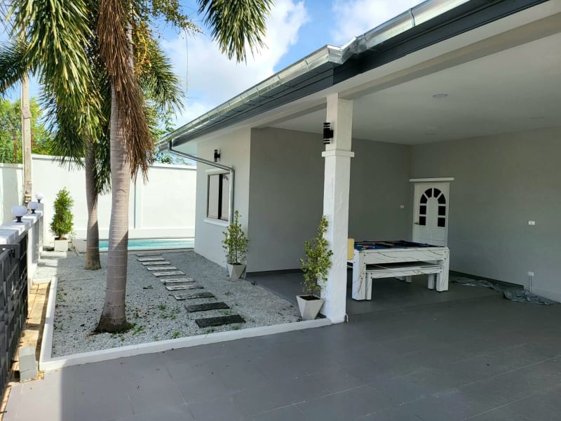 The house has 2 covered parking spaces and automatic gates. modern design swimming pool Thai kitchen and European kitchen with balcony Modern gazebo with comfortable garden furniture billiards and ping pong table washing machine and smart TV which all included in the price